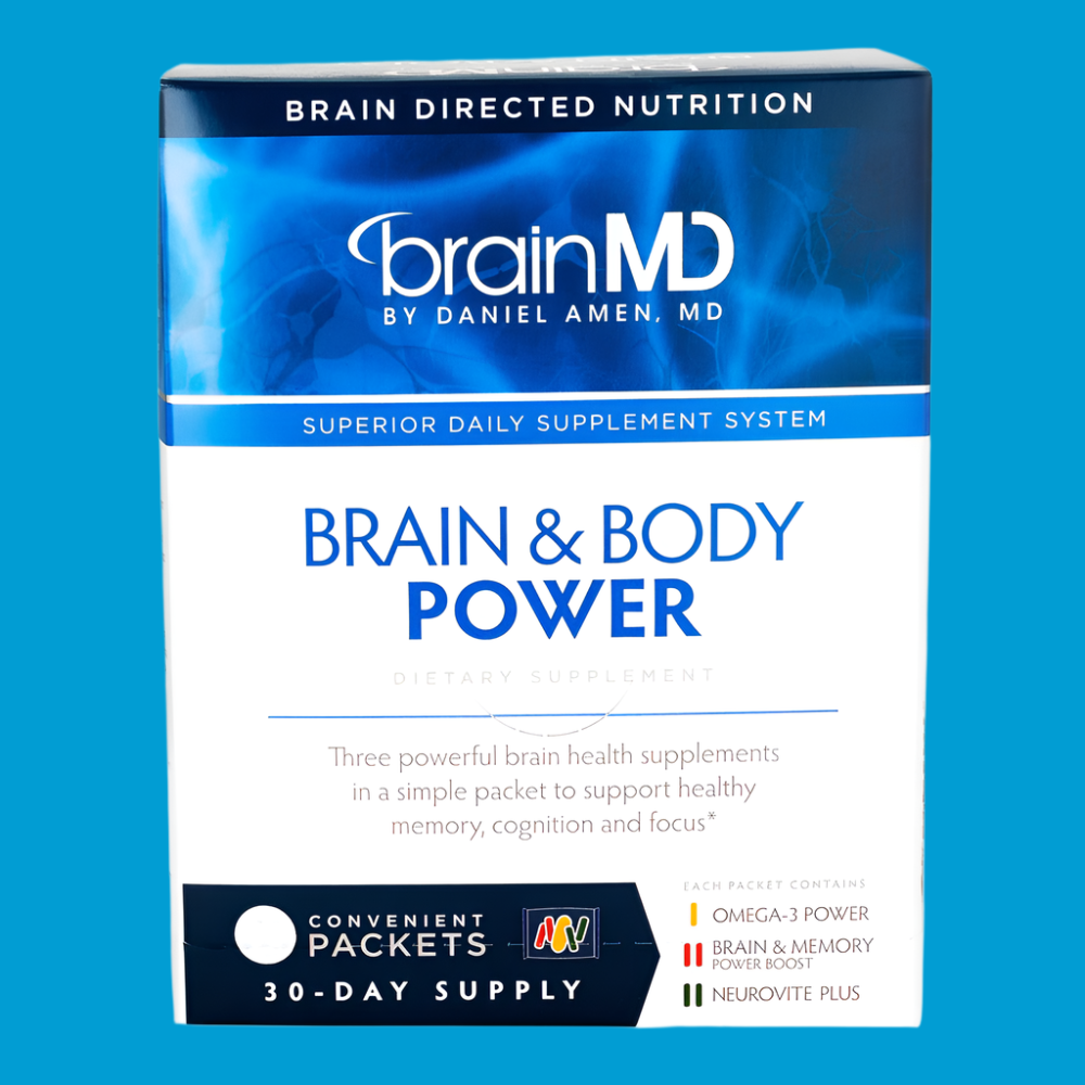 Brain & Body Power by BrainMD is a powerful 3-in-1 daily supplement system designed by Dr. Daniel Amen. Each packet delivers essential nutrients for optimal brain function, sustained energy, and total-body wellness. Featuring three clinically studied formulas—NeuroVite Plus Multivitamin, Omega-3 Power, and Brain & Memory Power Boost—this convenient system supports memory, mood, focus, and cellular protection in one easy-to-use daily packet.