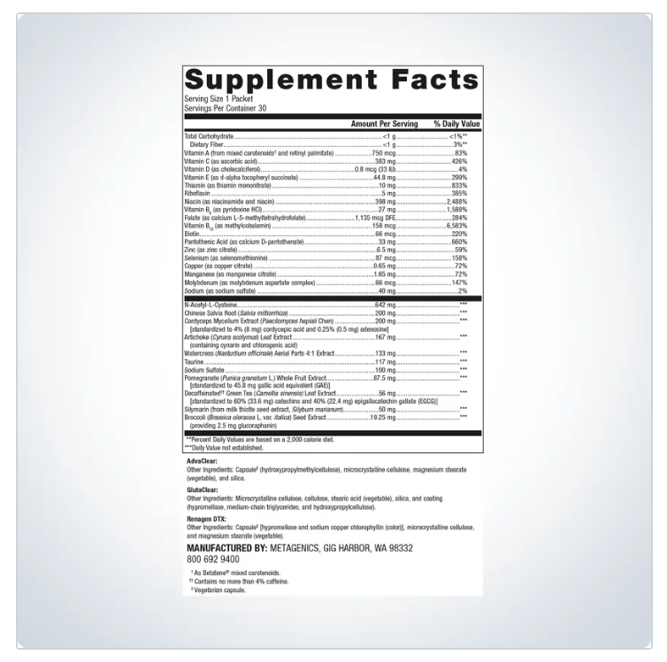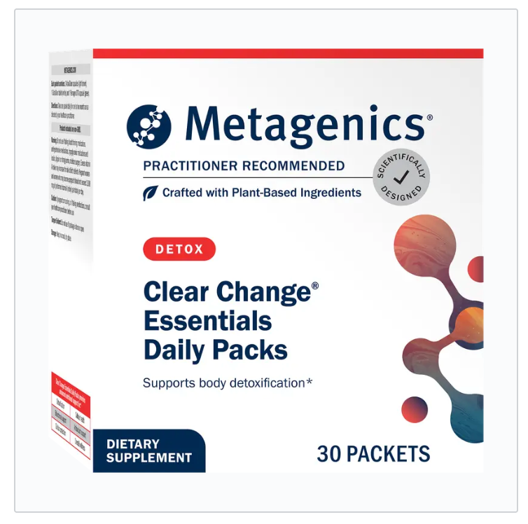Clear Change® Essentials Daily Packs by Metagenics are designed to support your body’s natural detoxification processes—one packet at a time. This once-daily formula contains three powerful supplements: AdvaClear®, GlutaClear®, and Renagen™ DTX, all combined to promote phase I and phase II liver detox pathways, antioxidant defense, and kidney function.
