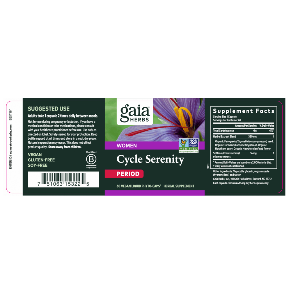 Cycle Serenity by Gaia Herbs is a premium herbal formula designed to promote emotional balance, hormonal stability, and positive mood throughout the menstrual cycle. Featuring clinically studied Saffron extract, this vegan supplement supports a calm, uplifted mood and helps manage irritability, mild anxiety, and fatigue that may occur during PMS or hormonal fluctuations. Enhanced with Fenugreek, Turmeric, and Hawthorn, it also helps regulate hormones, support heart health, and reduce oxidative stress.