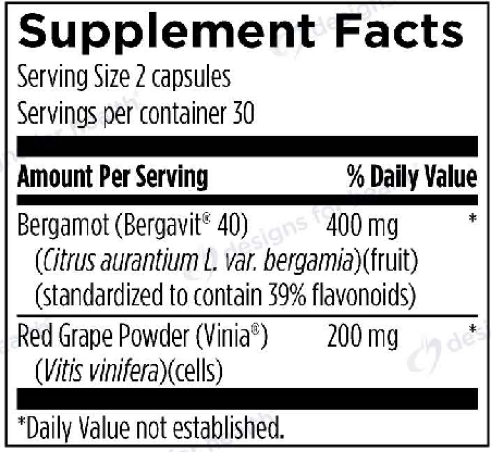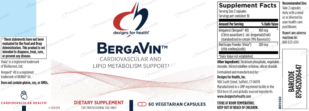 BergaVin™ by Designs for Health combines two clinically studied ingredients—Bergavit® 40 (bergamot extract) and Vinia® (red grape powder)—to promote cardiovascular wellness and antioxidant protection. Together, these plant-based compounds help maintain healthy lipid metabolism, support vascular integrity, and promote a balanced inflammatory response.