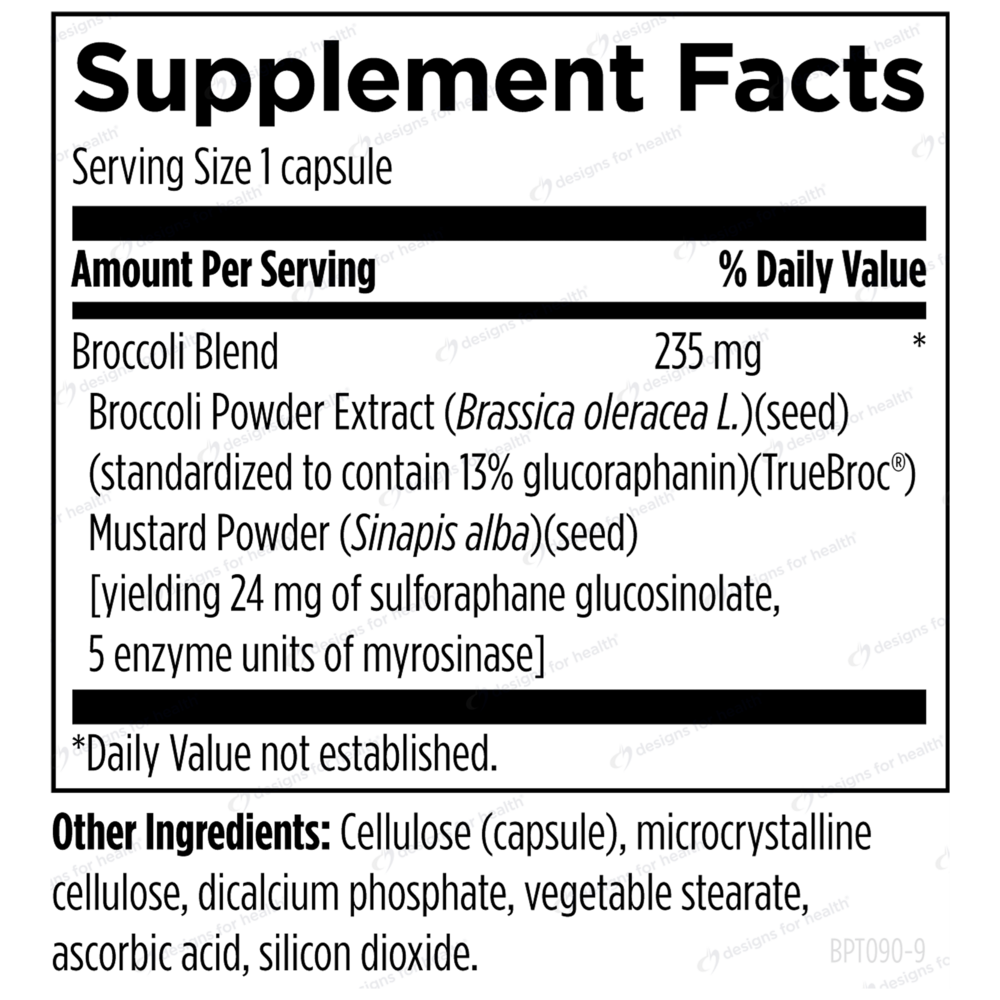 BroccoProtect™ by Designs for Health delivers a highly bioavailable source of sulforaphane glucosinolate—a compound derived from specially cultivated broccoli seed extract and sprout concentrate known for its potent detoxification and antioxidant properties.