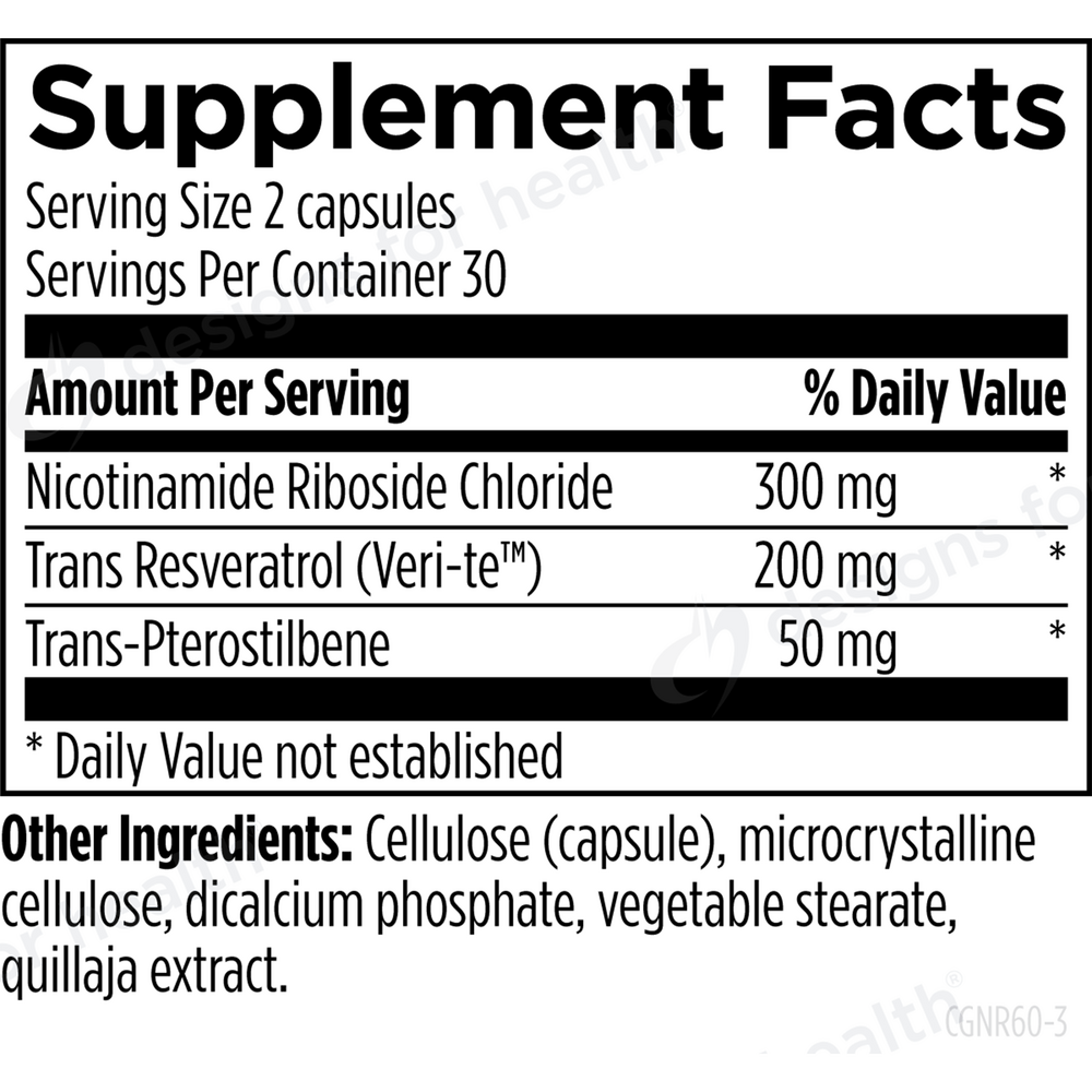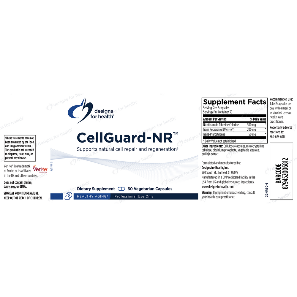 CellGuard-NR™ by Designs for Health is a next-generation cellular health formula designed to promote healthy aging, cellular repair, and antioxidant defense. This professional-grade blend features Niagen® (nicotinamide riboside chloride), Veri-te™ trans-resveratrol, and pterostilbene — three synergistic nutrients that support optimal NAD+ production, DNA repair, and cellular energy metabolism.
