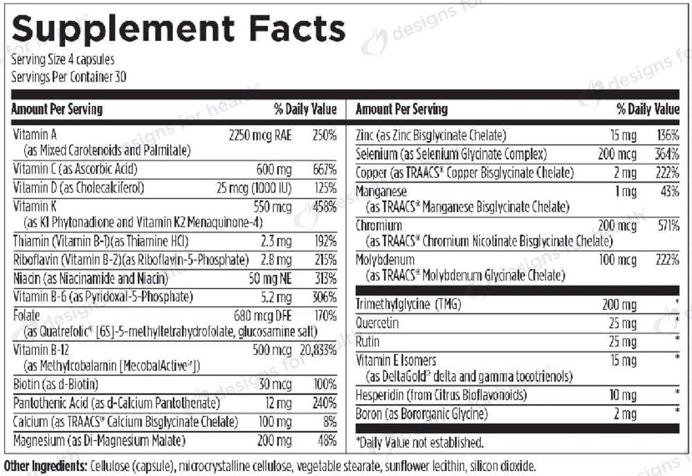 | Folate (Quatrefolic® L-5-MTHF) | 680 mcg DFE | 170% |
