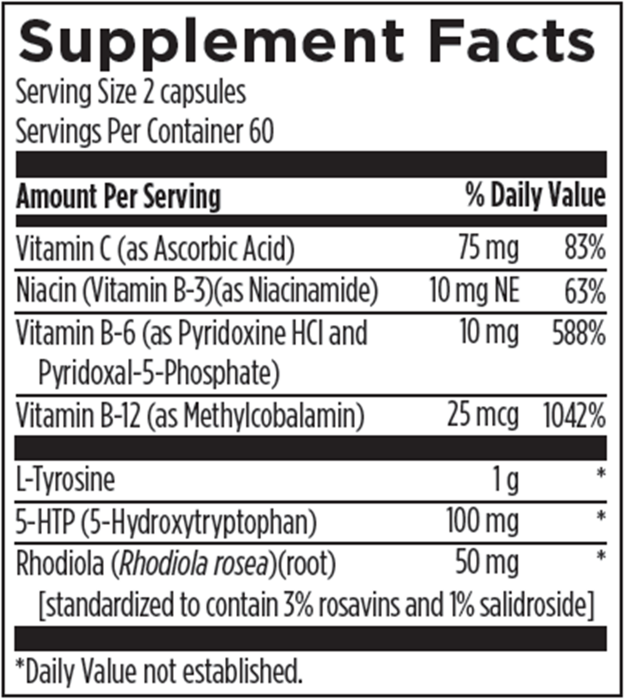 This synergistic formula features L-Tyrosine and 5-Hydroxytryptophan (5-HTP) in a clinically balanced 10:1 ratio, providing essential precursors for dopamine and serotonin synthesis — key neurotransmitters that influence mood and food cravings.* To further enhance this effect, Rhodiola rosea, an adaptogenic herb, helps promote resilience to stress and supports emotional balance.*