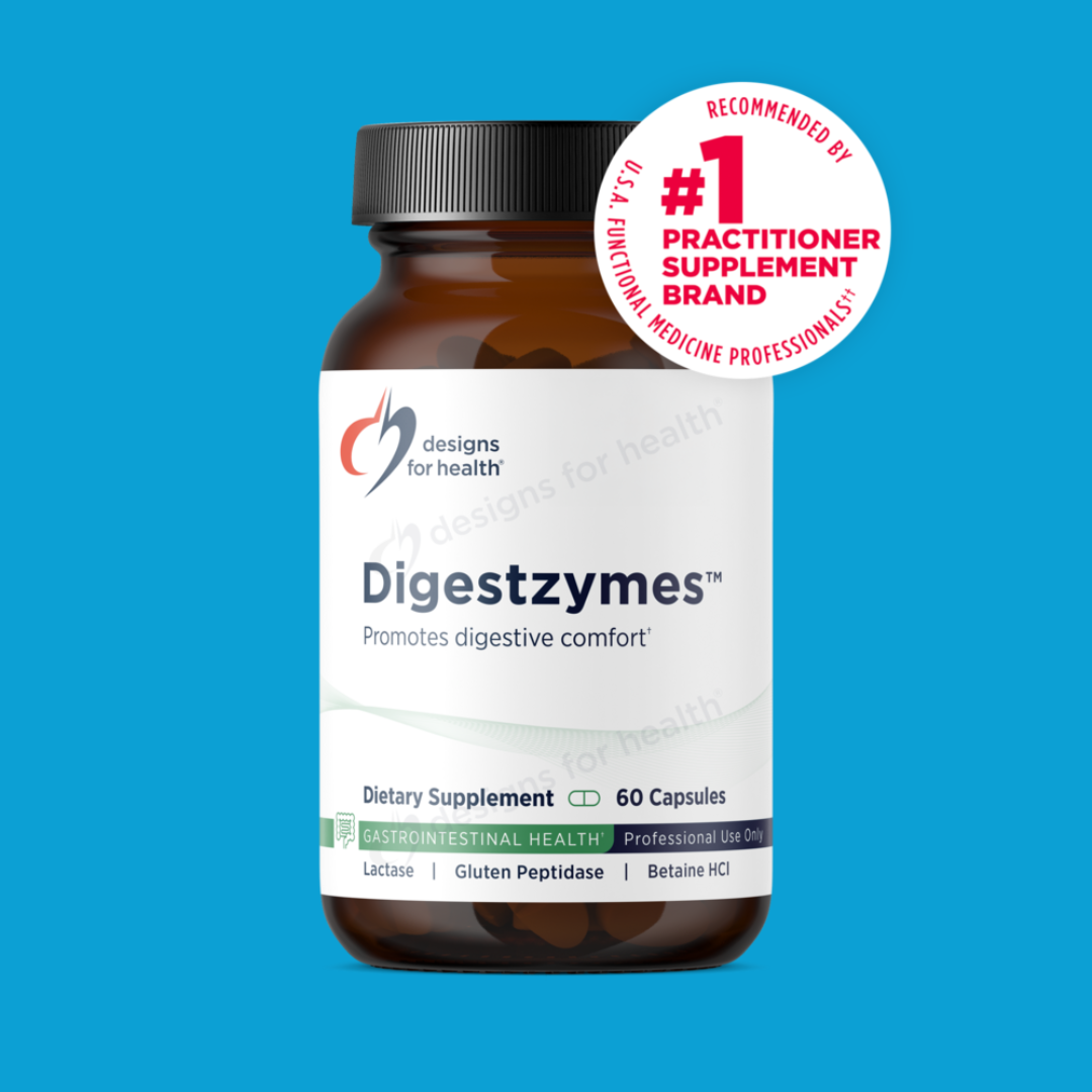 Digestzymes™ by Designs for Health is a comprehensive, high-potency digestive enzyme formula designed to support the optimal breakdown of proteins, fats, carbohydrates, and dairy sugars.