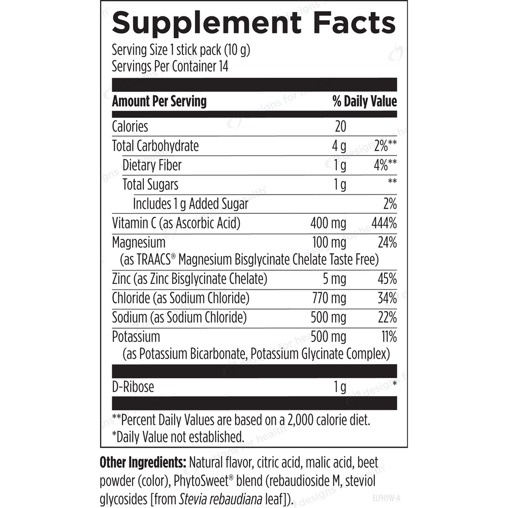 ElectroPure Hydration™ by Designs for Health is a high-potency electrolyte drink mix created to support proper hydration, exercise performance, and healthy muscle function.* With 100% more electrolytes than a leading hydration brand, this formula replenishes minerals lost through sweat, heat exposure, sauna use, or physical activity.*