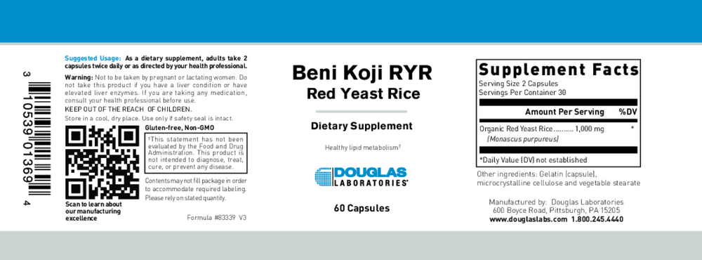 Beni Koji RYR by Douglas Laboratories provides organic red yeast rice fermented with Monascus purpureus — a traditional preparation used to help support *healthy blood lipid levels already within the normal range.