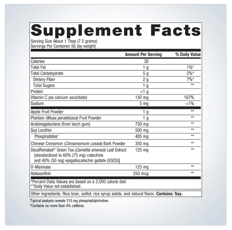 - Features plantain, green tea, and apple fruit powder for GI integrity