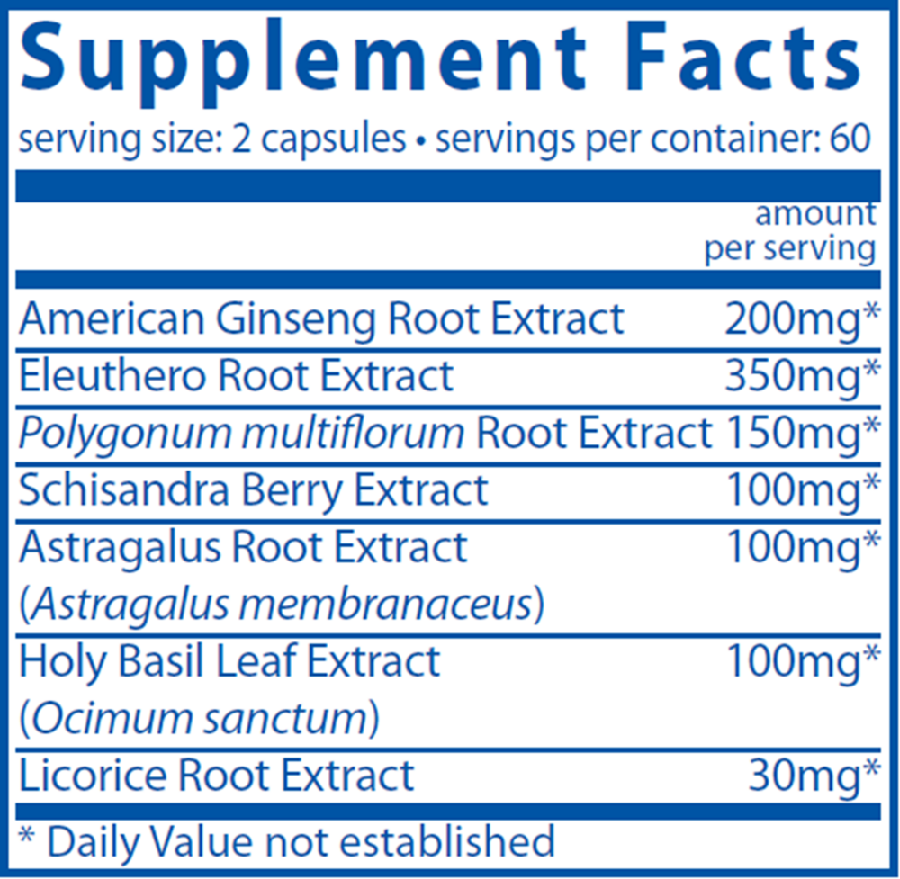 | Eleuthero Extract (Eleutherococcus senticosus, root, standardized to 0.8% eleutherosides) | 350 mg | † |