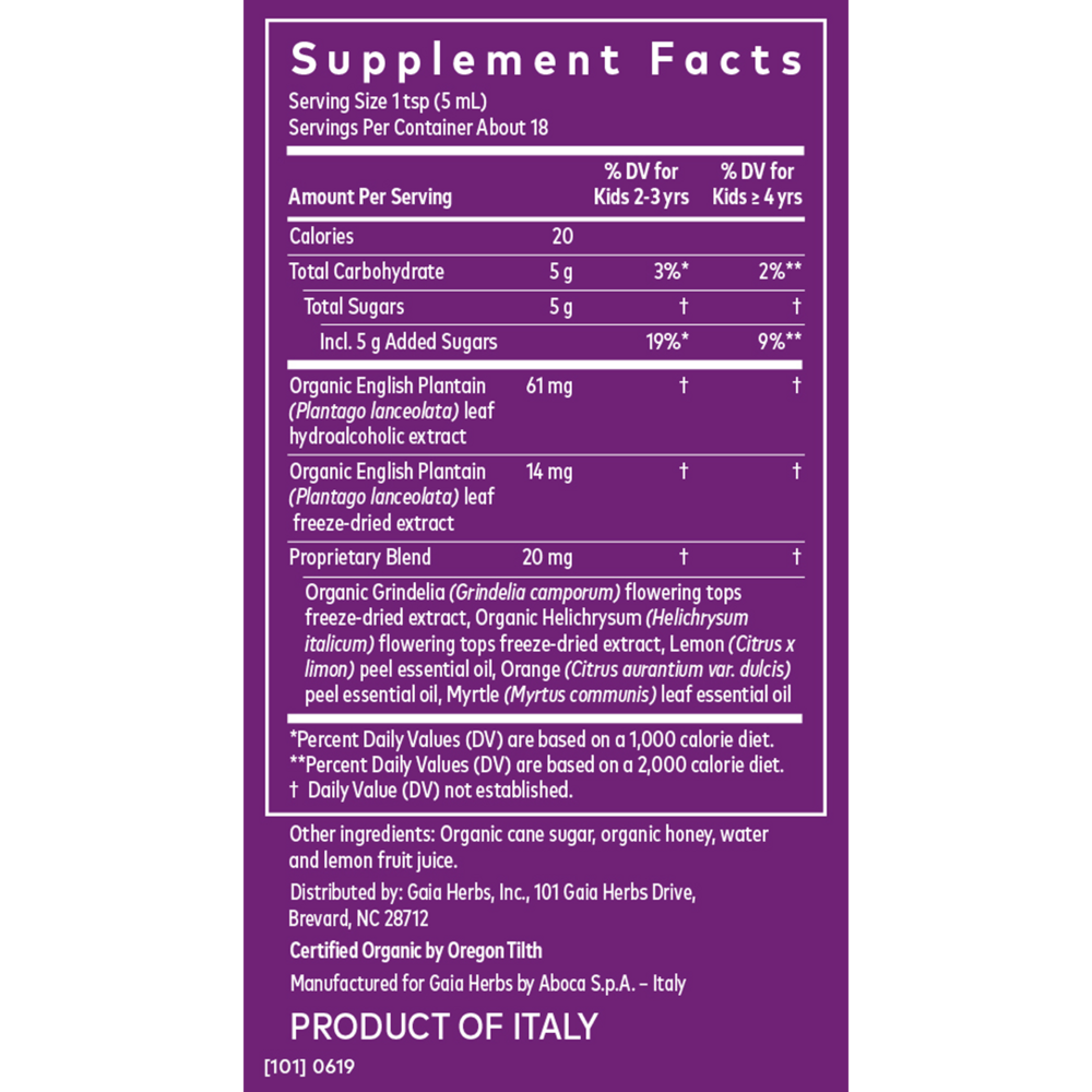 GaiaKids® Bronchial Wellness Syrup is a certified organic herbal formula designed to support respiratory health and soothe occasional throat irritation in children. Made with a synergistic blend of English Plantain, Mullein, Red Clover, Grindelia, and Thyme, and naturally sweetened with organic honey, this syrup helps maintain clear airways and comfort during seasonal challenges.