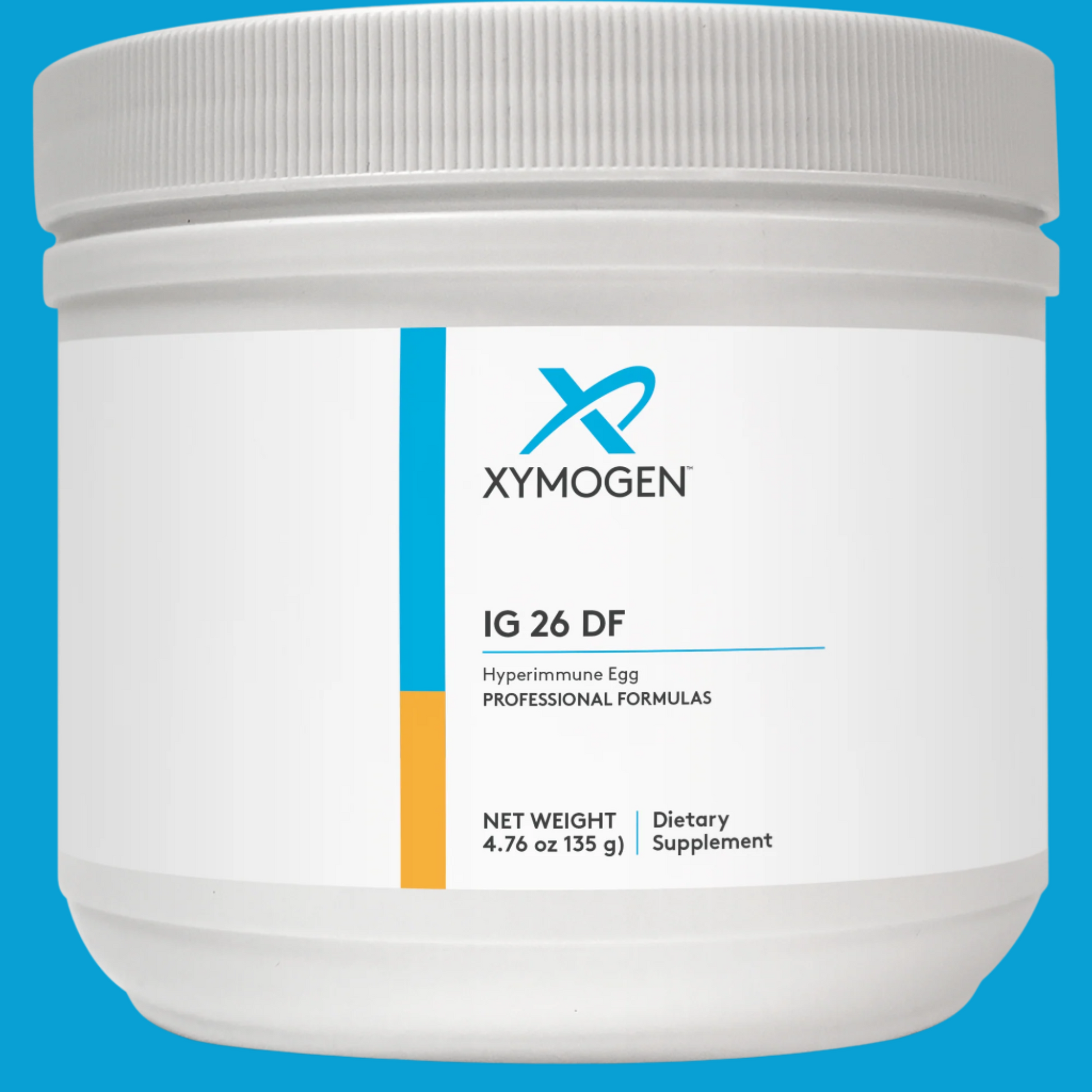 IG 26 DF by XYMOGEN, available at Rock Ridge Pharmacy, features IgY Max™—a self-affirmed GRAS source of IgY immunoglobulins and immune-regulating molecules derived from hyperimmune chicken egg. This innovative, dairy-free formula supports intestinal immune function, promotes a healthy gut environment, and positively impacts extraintestinal health.