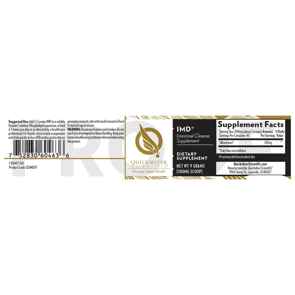 Intestinal Metals Binder Due to the strength of this product, please consult with your healthcare practitioner to purchase. Multi-Metal Binder – IMD® is a proprietary, highly purified silica with sulfur metal-binding groups. It is intended to pull methylmercury and other heavy metals away from the intestinal lining and help escort them safely out of the body.* Detox + GI Support- This product is designed to support the restoration of blocked detoxification pathways and a proper intestinal inflammatory response. Toxin Removal without Chelation – IMD® acts primarily in the intestines and does not enter the bloodstream, and thus should not cause surges in mobilized metals that can burden the kidneys and liver.