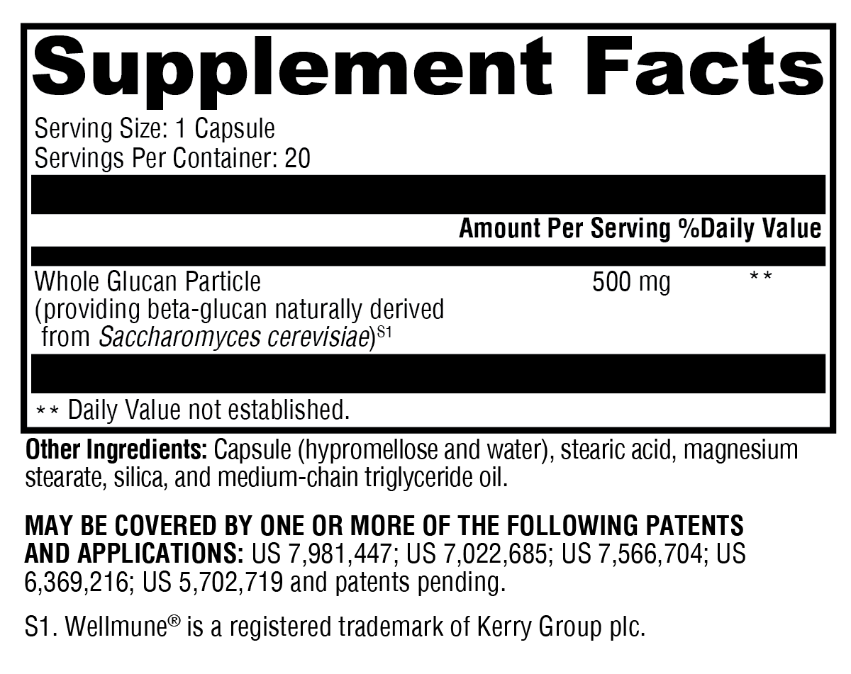 Wellmune® Whole Glucan Particle (beta 1,3/1,6 glucan) | 500 mg | Strengthens first-line immune defenses and supports hematopoietic function |