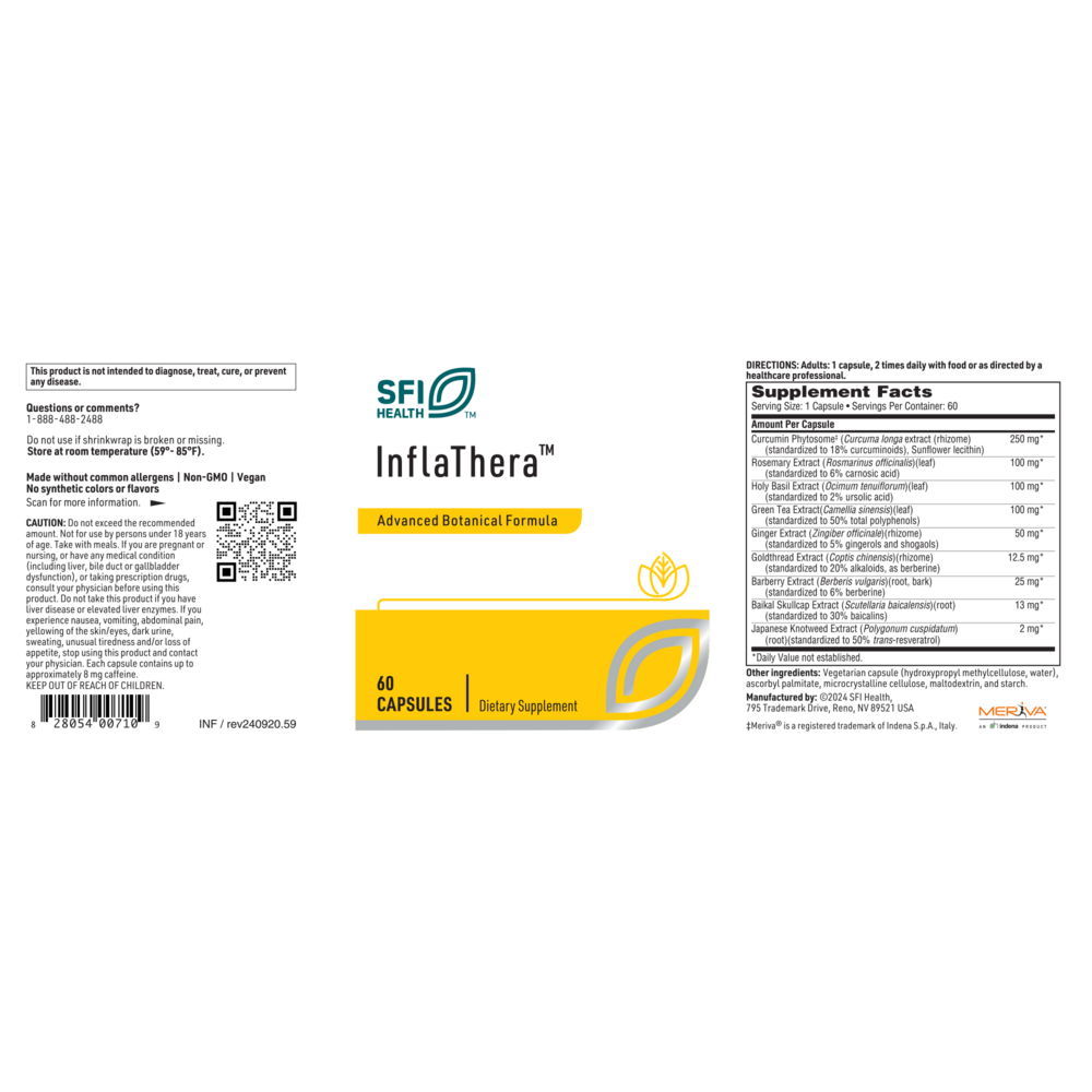 InflaThera™ by SFI Health is a powerful blend of nine botanical extracts designed to support a healthy inflammatory response and physiological balance throughout the body. Featuring Meriva® turmeric phytosome for enhanced bioavailability, this advanced formula modulates key enzymes (COX-1 and COX-2), scavenges free radicals, and supports tissue health in the cardiovascular, immune, joint, and neurological systems. Ideal for adults seeking natural inflammation support backed by science.