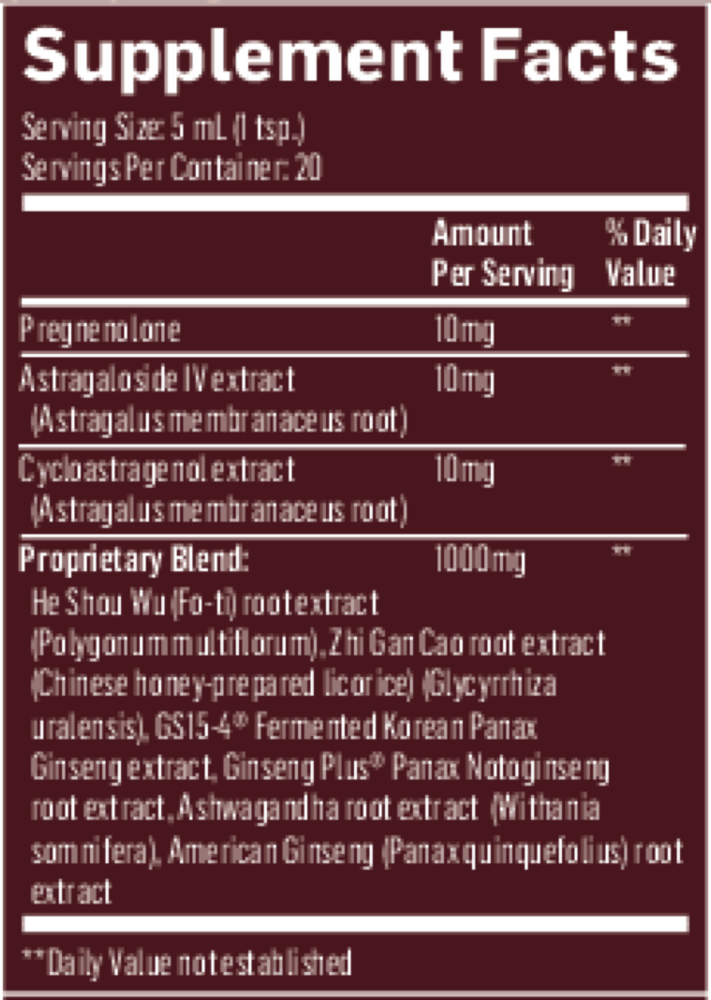 He Shou Wu (Fo-ti) root extract (Polygonum multiflorum), Zhi Gan Cao root extract (Chinese honey-prepared licorice) (Glycyrrhiza uralensis), GS15-4® Fermented Korean Panax Ginseng extract, Ginseng Plus® Panax Notoginseng root extract, Ashwagandha root extract (Withania somnifera), American Ginseng (Panax quinquefolius) root extract