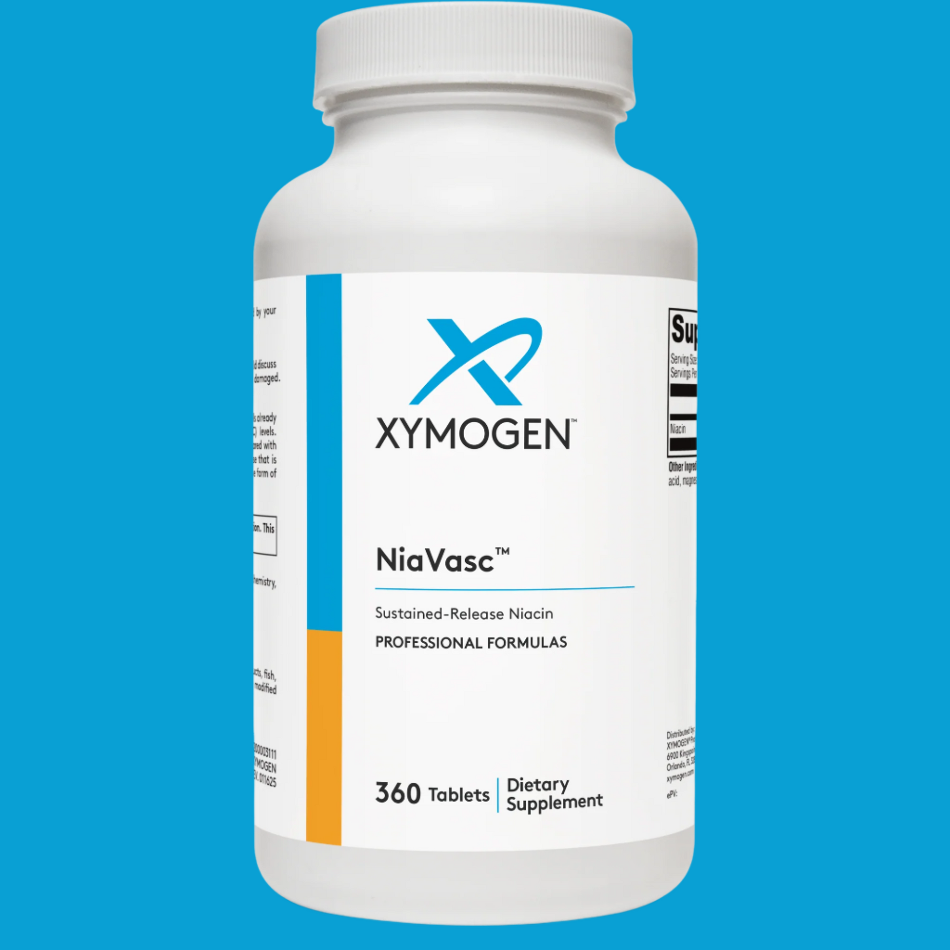 NiaVasc™ by XYMOGEN, available at Rock Ridge Pharmacy, features sustained-release niacin designed to support healthy lipid levels, particularly promoting optimal high-density lipoprotein cholesterol (HDL-C). Using a proprietary wax-coated technology, NiaVasc™ provides controlled niacin release over seven to eight hours—considered the ideal release profile to minimize the flushing effect associated with standard niacin supplements.