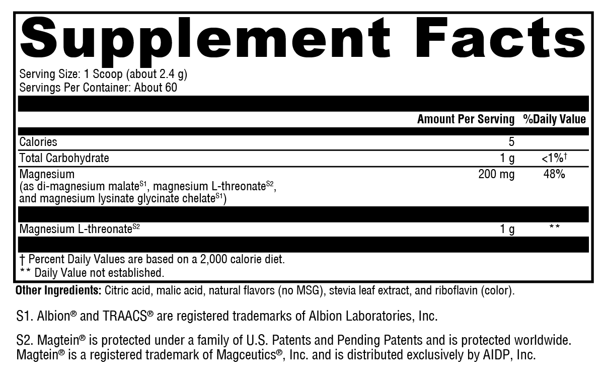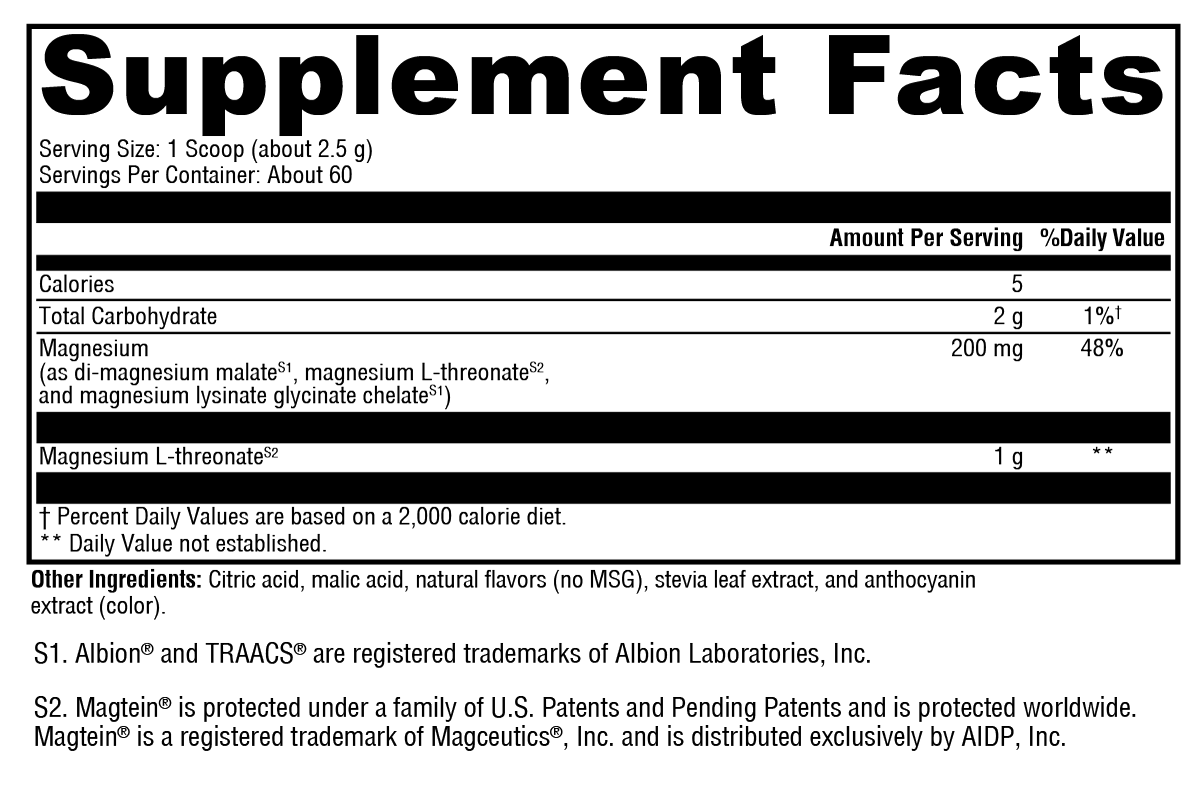 Magnesium (as Magtein® Magnesium L-Threonate, Albion® Di-Magnesium Malate, and TRAACS® Magnesium Lysinate Glycinate Chelate) | 300 mg | Supports brain function, cognitive health, mood balance, and sleep quality* |
