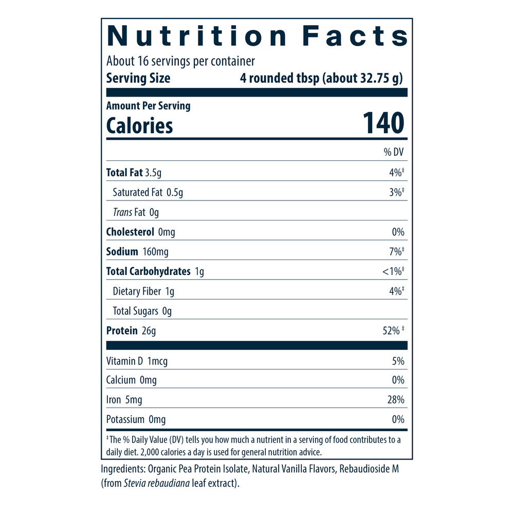 Other Ingredients: Organic Pea Protein Isolate, Natural Vanilla Flavors, Rebaudioside M (from Stevia rebaudiana leaf extract).