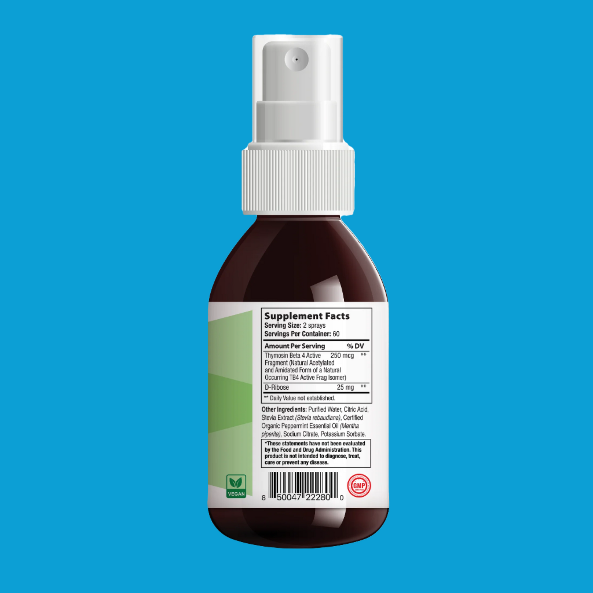 TB4-Frag™ Oral Spray is designed for individuals seeking an easy and effective way to support their immune health. The improved formula provides a potent dose of Thymosin Beta 4 fragment and D-Ribose, promoting immune system function and energy production in a refreshing peppermint-flavored spray.