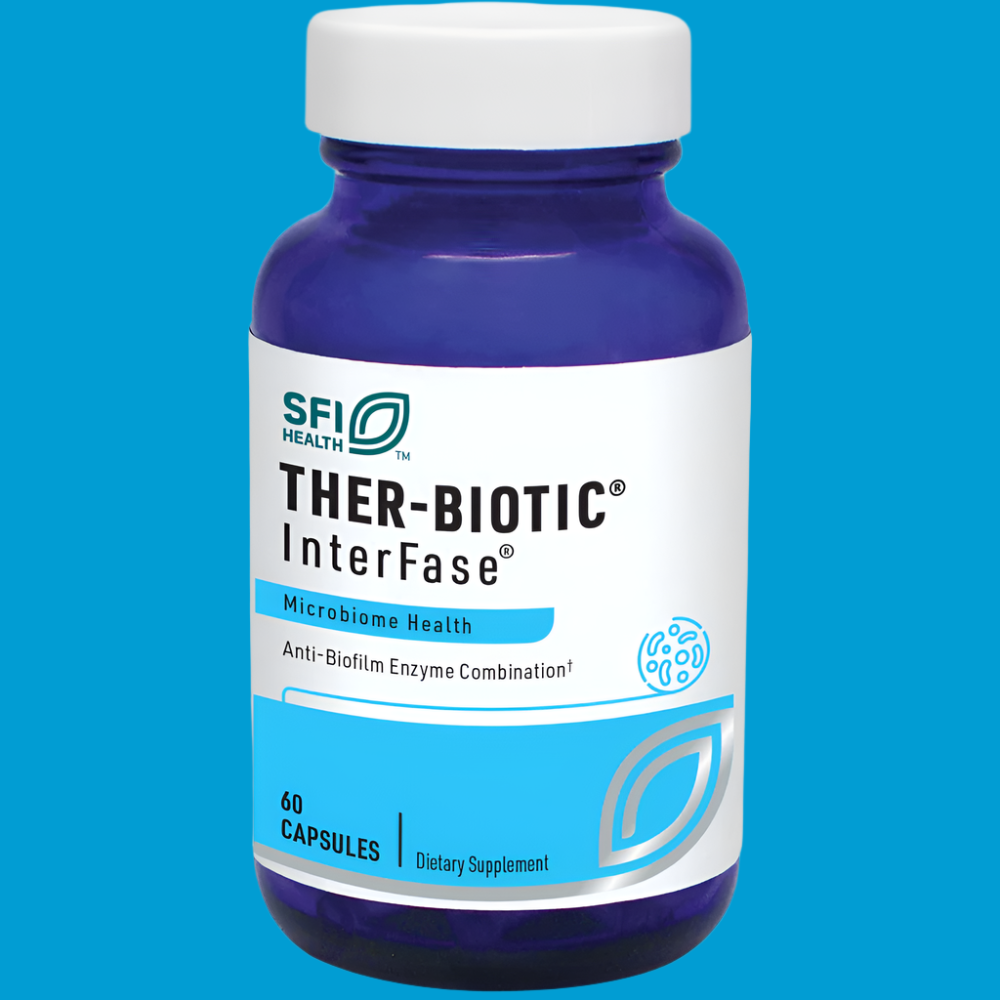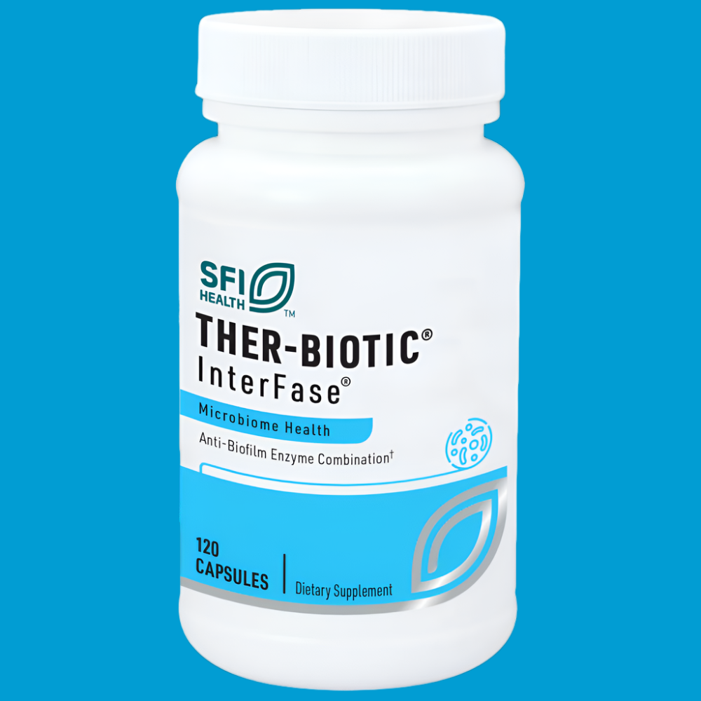Ther-Biotic® InterFase® by SFI Health is a professional-grade enzyme formula specifically designed to disrupt microbial biofilms and support a healthy gut environment. Biofilms are protective matrices produced by bacteria and yeast that can shield these organisms from natural immune defenses and antimicrobial treatments. The unique enzyme blend in InterFase® helps degrade these barriers, allowing for better microbial balance and improved digestive and immune health.†