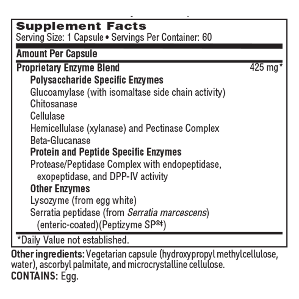 *Includes: Glucoamylase, Chitosanase, Cellulase, Hemicellulase/Pectinase Complex, Beta-Glucanase, Protease/Peptidase Complex (with DPP-IV activity), Lysozyme (from egg), Serratia peptidase (enteric-coated) | ||