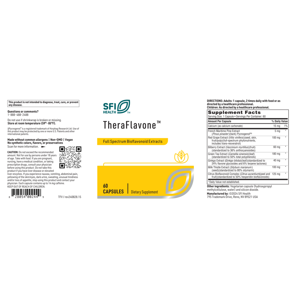 There are so many useful flavonoidrich plant extracts that it can be difficult and costly to take them individually when a balanced and broad-based protective approach is desired. TheraFlavone™ is specially formulated to provide a wide selection of different extracts with well-documented biochemical actions. Only full-spectrum extracts, not isolated flavonoids, are included thus preserving the synergistic activity of the full complement of phytonutrient compounds. TheraFlavone™ is a powerful formula providing support for immune function, circulatory health, liver detoxification mechanisms, and antioxidant pathways.* Two capsules are equivalent to 10 to 12 tablets or capsules of individual extracts taken separately. TheraFlavone™ combines the following full-spectrum plant extracts in one convenient product: Pycnogenol® Pine Bark Extract – Unique, patented extract from Horphag Research supplying proanthocyanidins and organic acids. Red Grape Extract – Prepared from the whole grape, not just the seeds, supplying proanthocyanidins, resveratrol, and other beneficial compounds. Bilberry Extract – Standardized to 25% anthocyanosides and providing as much active flavonoid per capsule as one bilberry capsule taken separately. Green Tea Extract – A rich source of polyphenols, standardized to 50% catechins for reliable activity. Each capsule is equivalent to one cup of green tea. Ginkgo Extract – A premium “24/6” extract containing less than 1% ginkgolic acid, an undesirable component, thus exceeding German Commission E specifications. Milk Thistle Extract – Supplies standardized amounts of silymarin, a hepatoprotective flavonolignan. Citrus Bioflavonoid Complex – Concentrated source of hesperidin, naringen, and other flavonoids from citrus fruit peel. Free of citric acid for better tolerance.