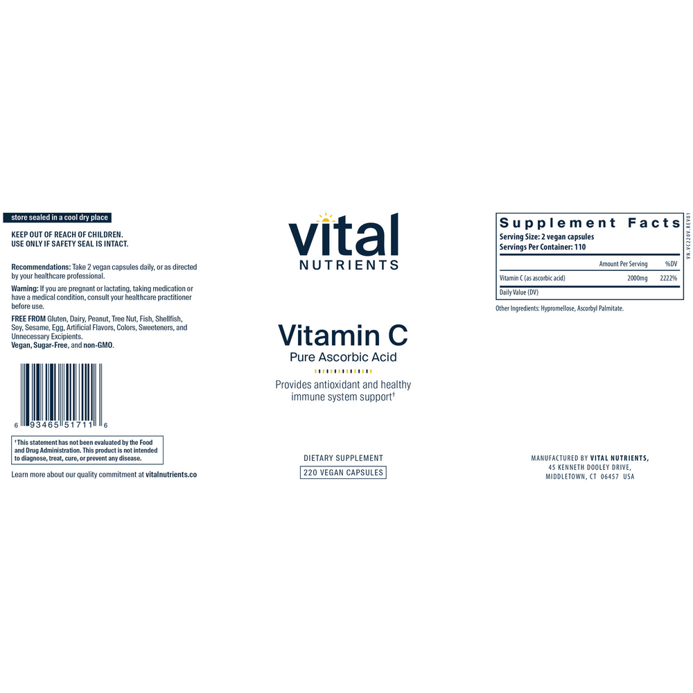 • Supports the immune system* • Promotes iron absorption* • Assists in tissue formation* Vitamin C (100% pure ascorbic acid) helps support the immune system.* It is one of the most potent dietary antioxidants and provides nutritional support to all functions of the body.* Vitamin C supports iron absorption from the gastrointestinal tract and is an important component of collagen synthesis.* Vitamin C assists in tissue formation.* It comes in easy-to-digest vegetarian capsules.*